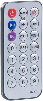 – Bedienung per Fernbedienung oder direkt am Gerät über blau beleuchteten Lautstärke-Drehregler und 4 Tasten: Mode, Wiedergabe/Pause, vor, zurück