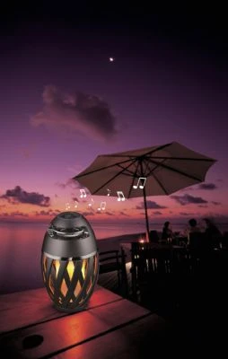 Bluetooth Lautsprecher von decotech mit 10 Watt für die Musikwiedergabe und dekoratives weiches LED-Licht mit flackerndem Flammen-Effekt.