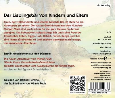 Der Lieblingsbär von Kindern und ElternPuuh, der weltberühmte und überall beliebte Bär, ist stets für ein Abenteuer zu haben. Die kurzen Geschichten aus dem Hundert-Morgen-Wald sind auch schon für die ganz kleinen Puuh-Fans geeignet. Der liebenswert-tollpatschige Bär und seine Freunde Tigger, I-Ah, Känga und Ruh sind immer füreinander da und erleben gemeinsam mal lustige, mal spannende Abenteuer.Gelesen von Roland Hemmo, der Erzählstimme bei Winnie Puuh.(1 CD, Laufzeit ca. 1h 10)